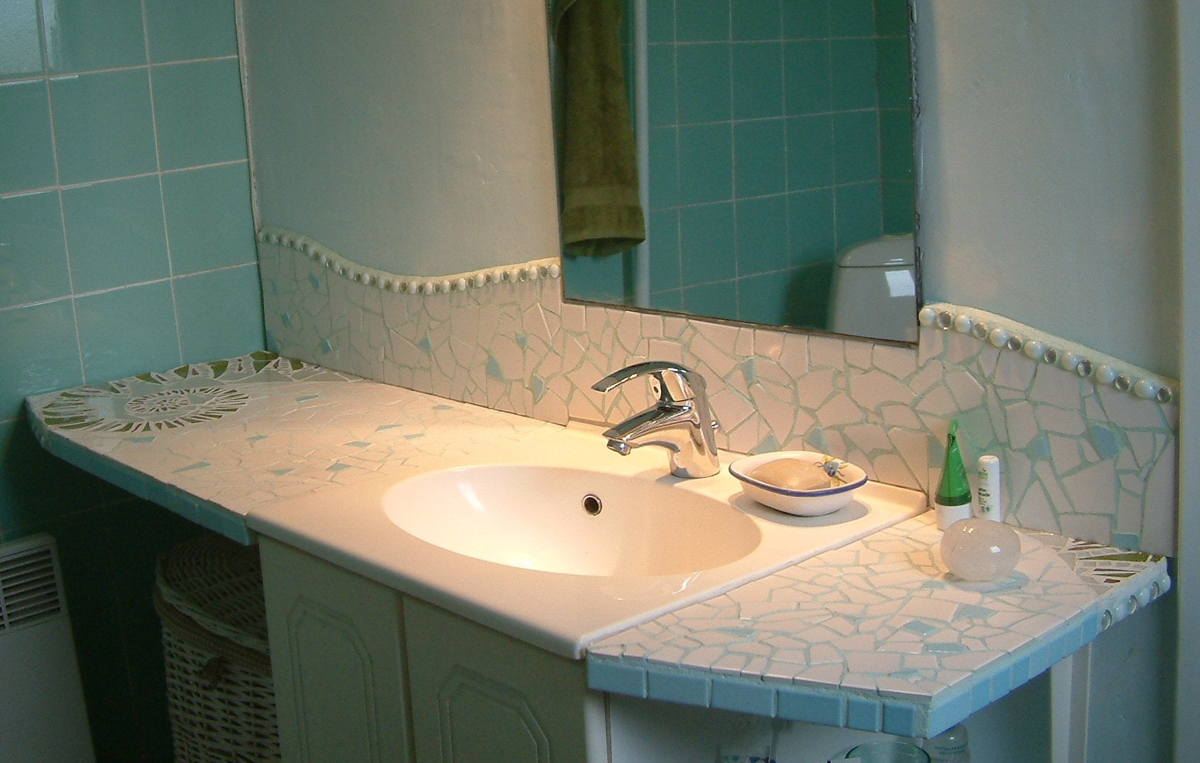 Mosaikudsmykningerne specialdesignes til den sammenhæng de indgår i. Her er eksempler på mosaikker ved køkkenvask og komfur, luksusspisehjørne til katten :) og et mosaikværk til badeværelse bygget sammen i en helhed omkring vask og spejl.