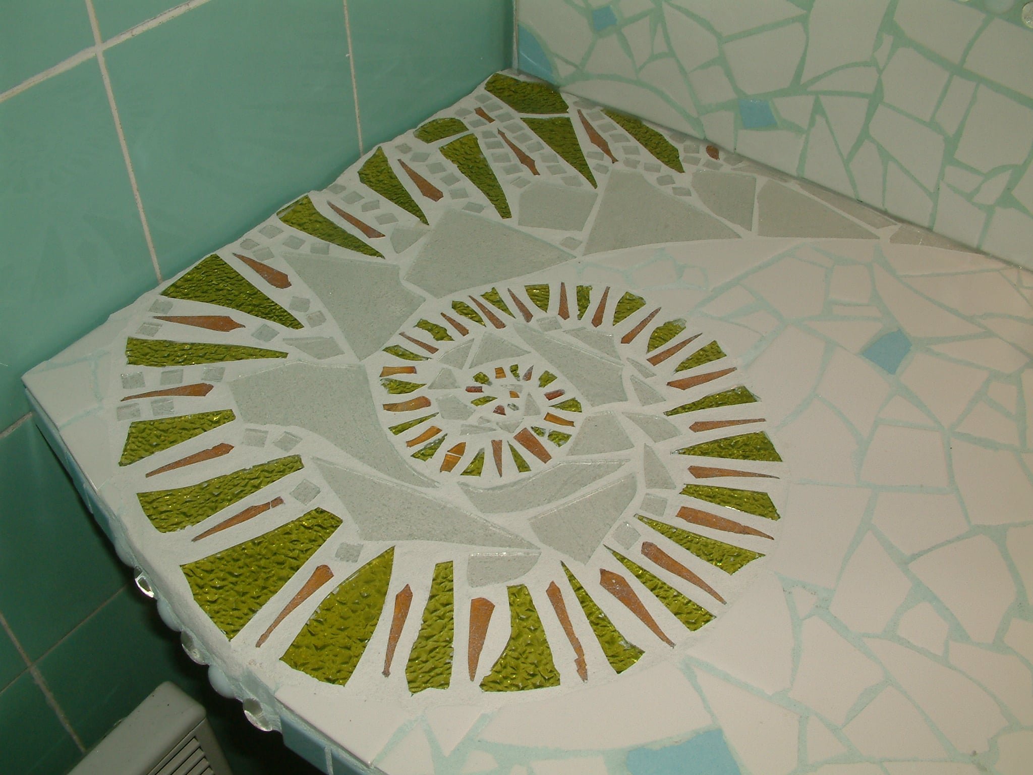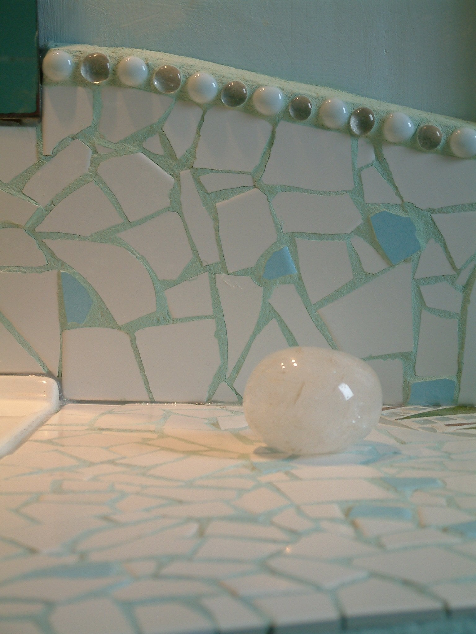 Grønt bobleglas m/ grøn glaskant og musling. Hvid fuge.