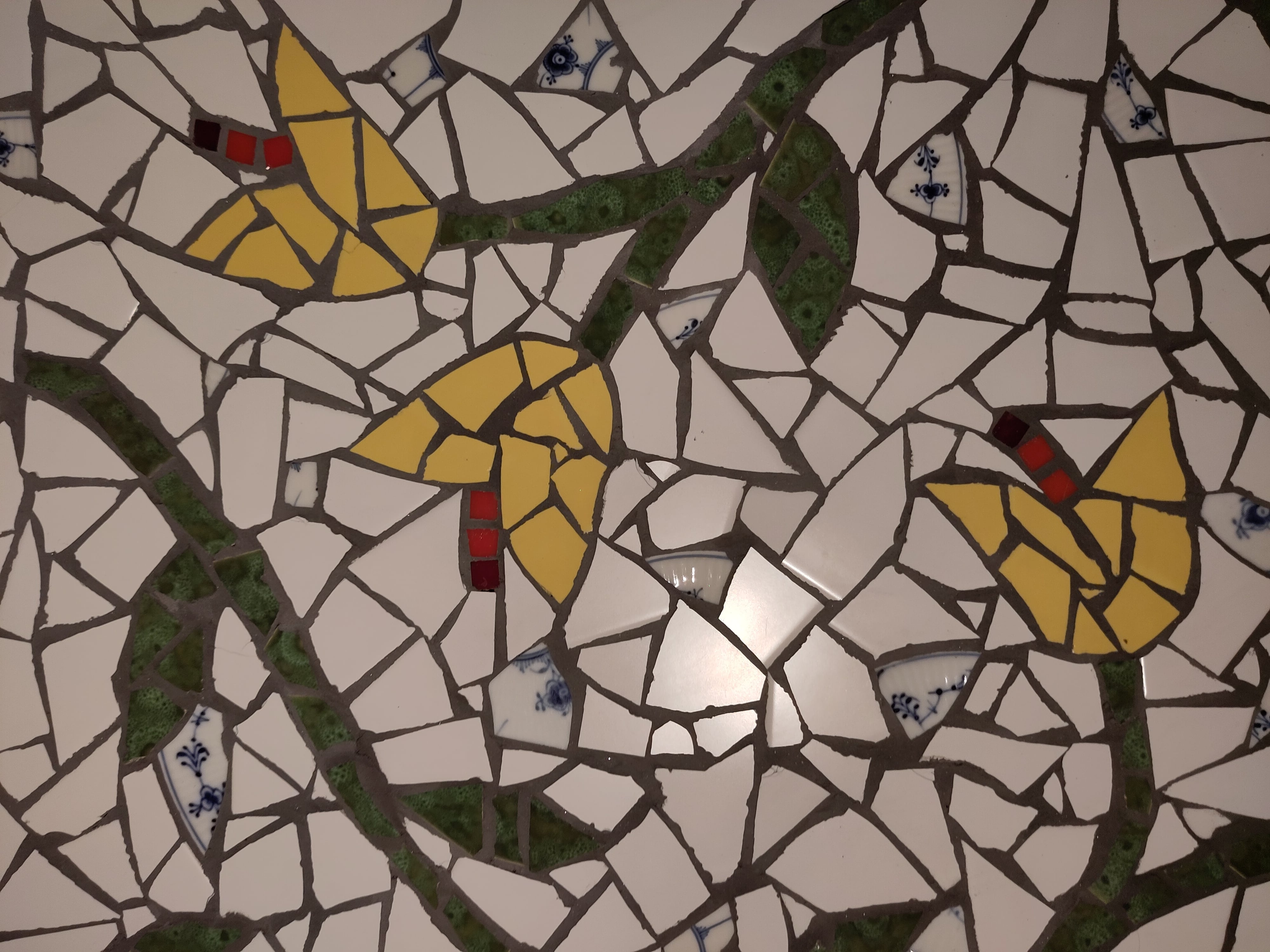 Rødt glas med sort glasmosaik og hvid fuge på flint.