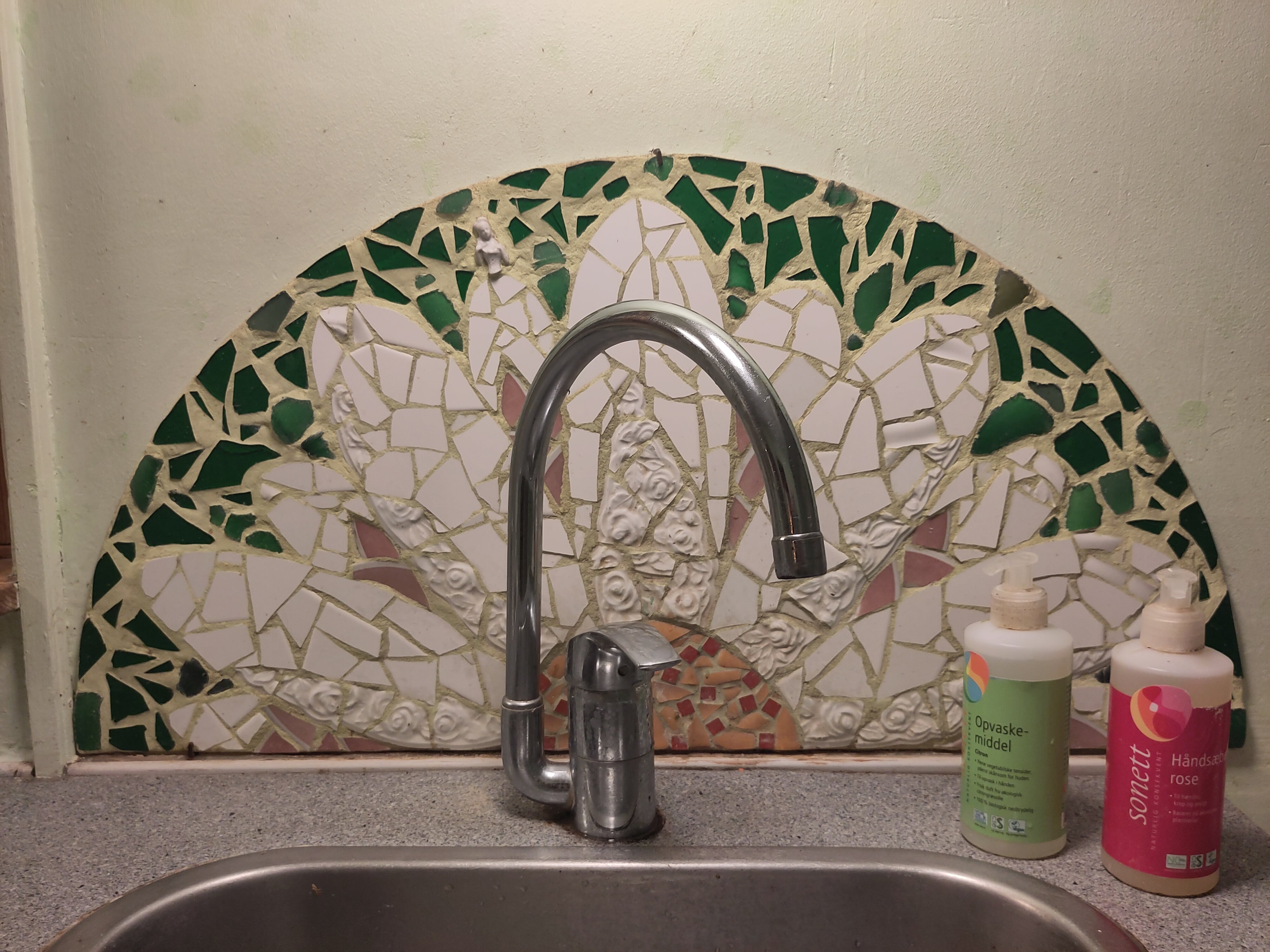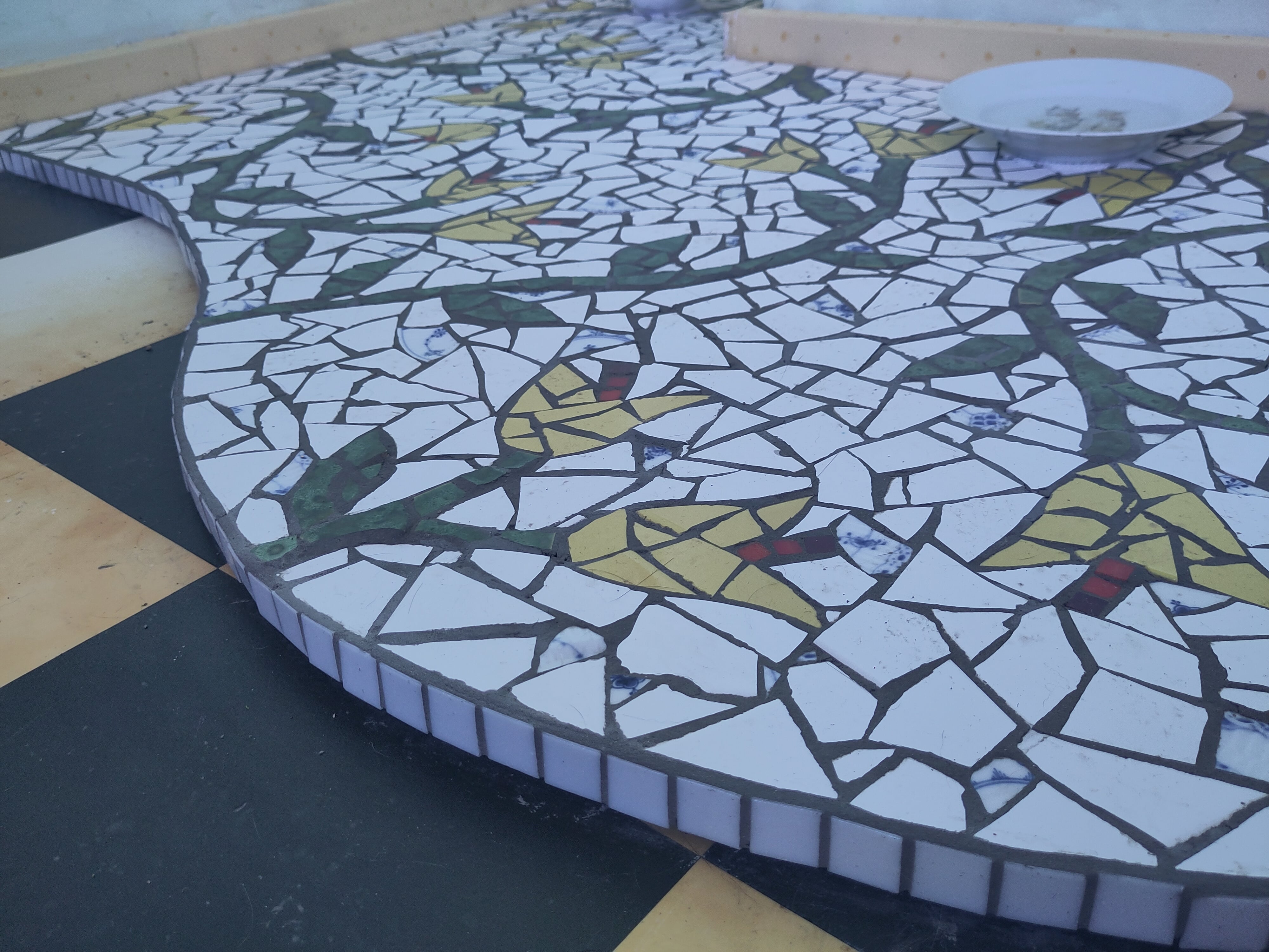 Blomstret portal med gul-orange keramikmosaikkant.
